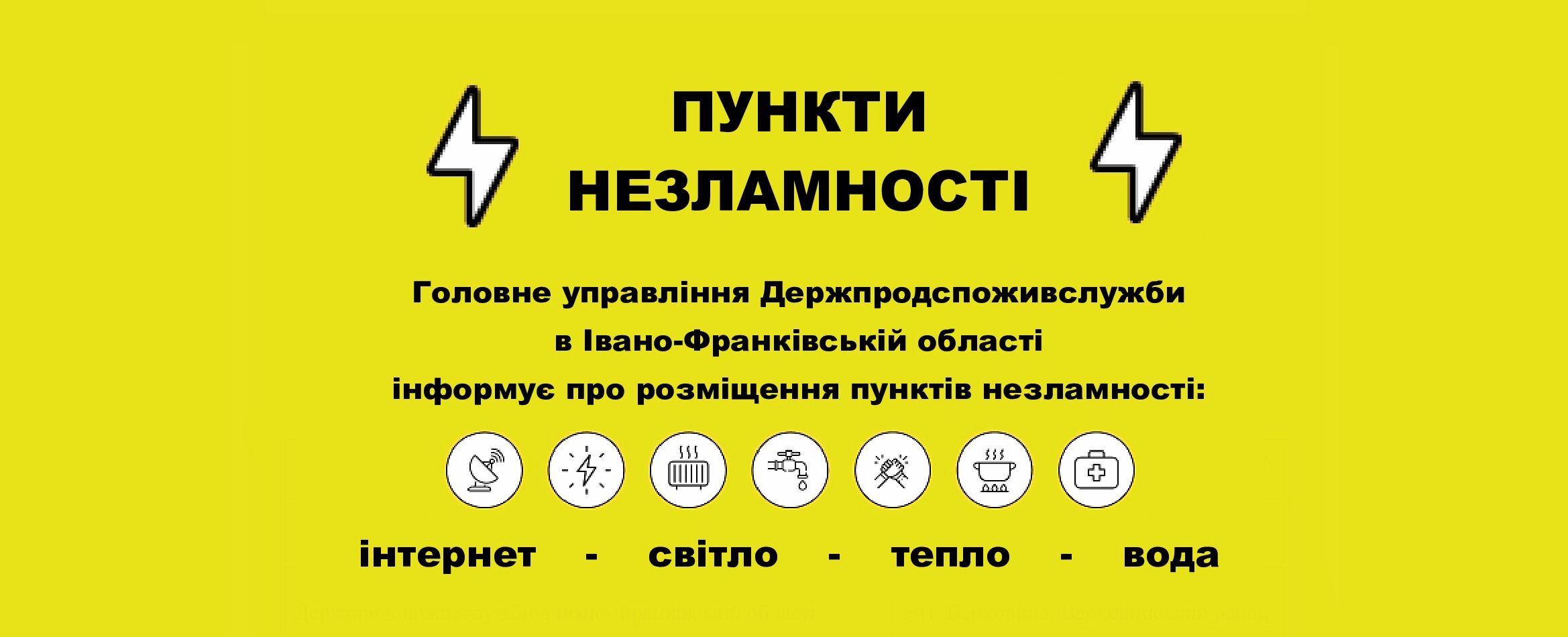 Головне управління Держпродспоживслужби в Івано-Франківській області інформує про початок роботи пунктів незламності, які розташовані за адресами структурних підрозділів в 15 населених пунктах області.