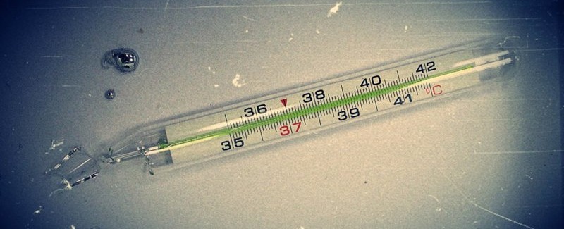 Із розбитого термометра витікає рідка ртуть, що має властивість випаровуватися при кімнатній температурі. А пари ртуті є сильною отрутою. Ртуть із розбитого градусника при ударі перетворюється на дрібні краплі і розсіюється по приміщенню. Вона легко проникає в тріщини підлоги, в щілини під плінтусами, застряє у ворсі килимів. Поступово випаровуючись, вона отруює повітря у приміщенні. Якщо людина дихає цим повітрям постійно, ртуть накопичується в організмі – в нирках, в печінці, у мозку, і в людини розвивається хронічна ртутна інтоксикація.