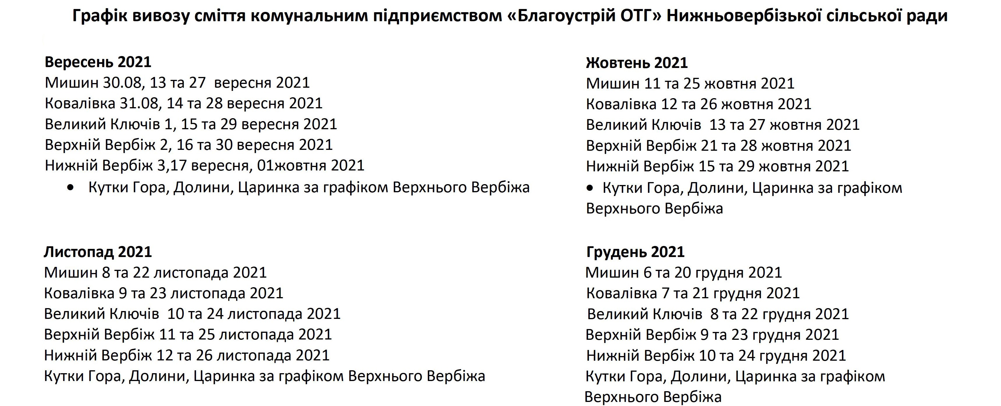 Графік вивозу сміття комунальним підприємством "Благоустрій ОТГ" Нижньовербізької сільської ради
