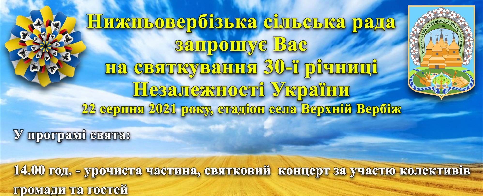 22 серпня - урочистості та святковий концерт, присвячені 30-ій річниці Незалежності України, місце проведення стадіон села Верхній Вербіж...