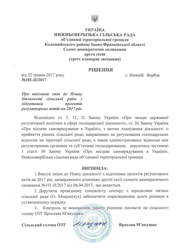 Про план діяльності сільської ради з підготовки проектів регуляторних актів на 2017 рік